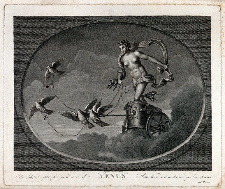 Credit: Astronomy: Venus in her chariot, drawn by doves. Engraving by C. Lasinio after Raphael, 1516. Credit: Wellcome Collection. Attribution 4.0 International (CC BY 4.0)